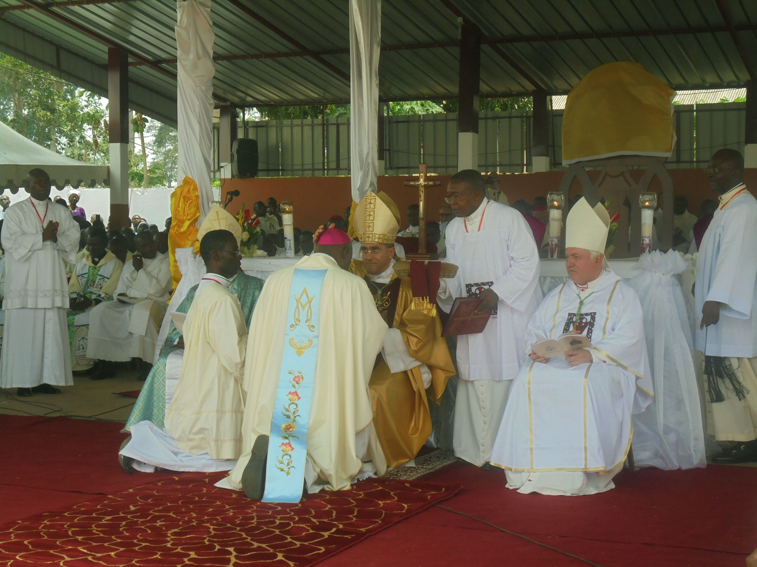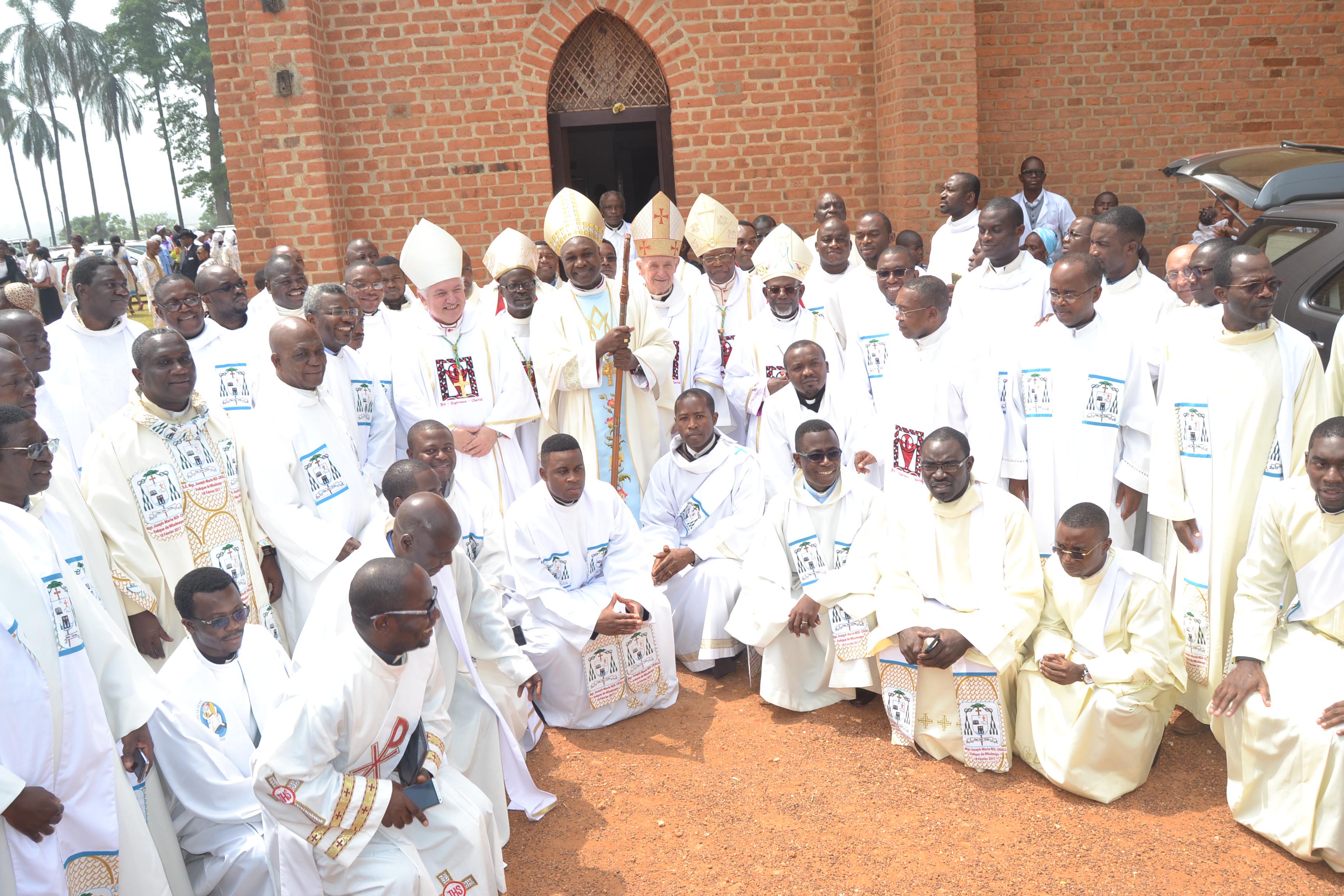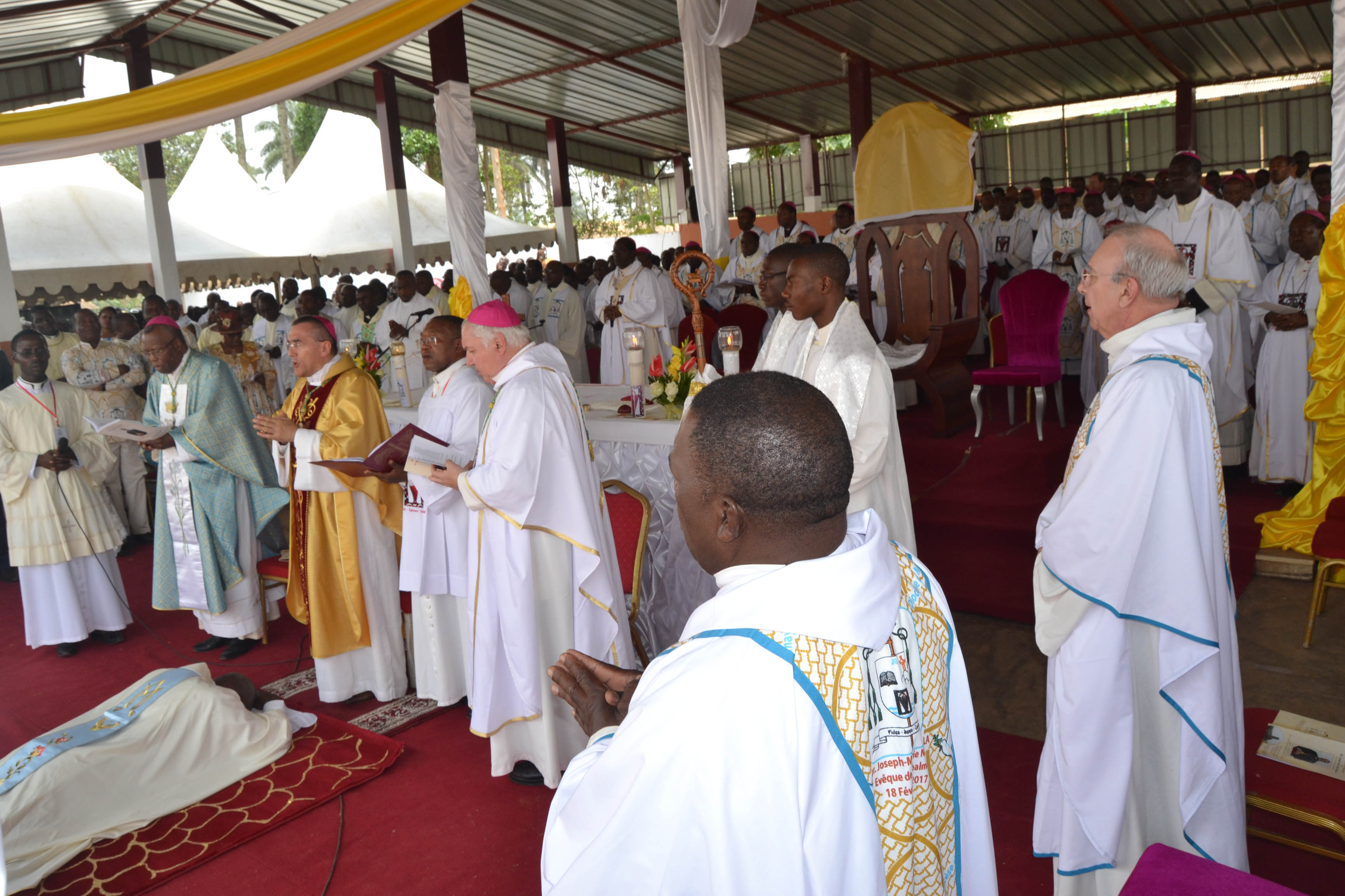 À la droite du Nonce Apostolique, il y avait Mgr Adalbert Ndzana, évêque émérite de Mbalmayo. L’autre évêque consécrateur était Mgr Jean-Marc Aveline, évêque auxiliaire de Marseille qui a voulu participer à cet événement avec une délégation d’amis de Mgr Joseph-Marie, ses anciens étudiants de la pastorale universitaire, venant de France. Une trentaine d’évêques de différents diocèses du Cameroun, accompagnés par le Président de la Conférence épiscopale, Mgr Samuel Kleda, et de la région de l’Afrique Centrale, notamment du Gabon, du Congo-Brazzaville et de la Guinée équatoriale, ont concélébré ainsi avec environ trois cents prêtres de Mbalmayo et d’ailleurs.