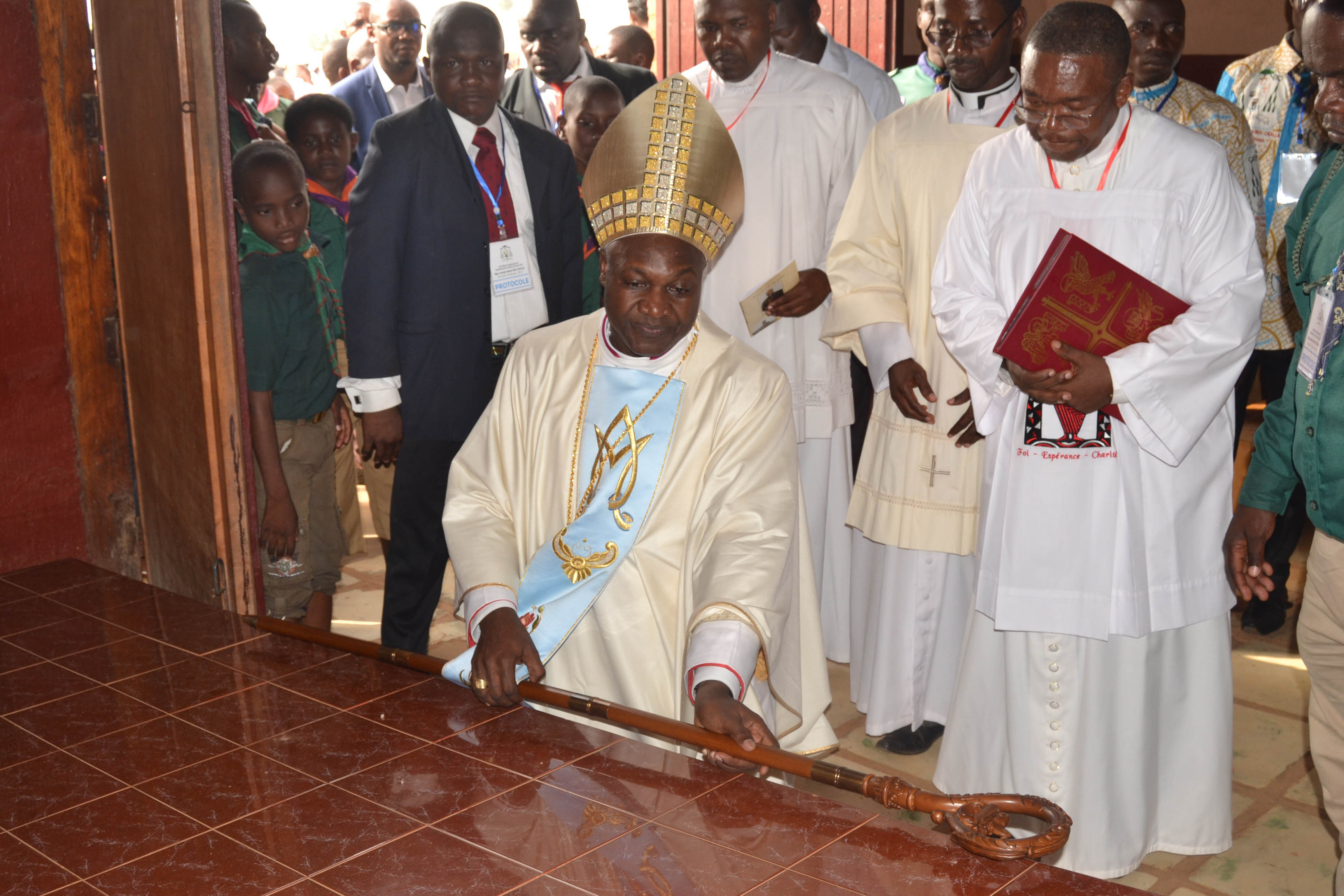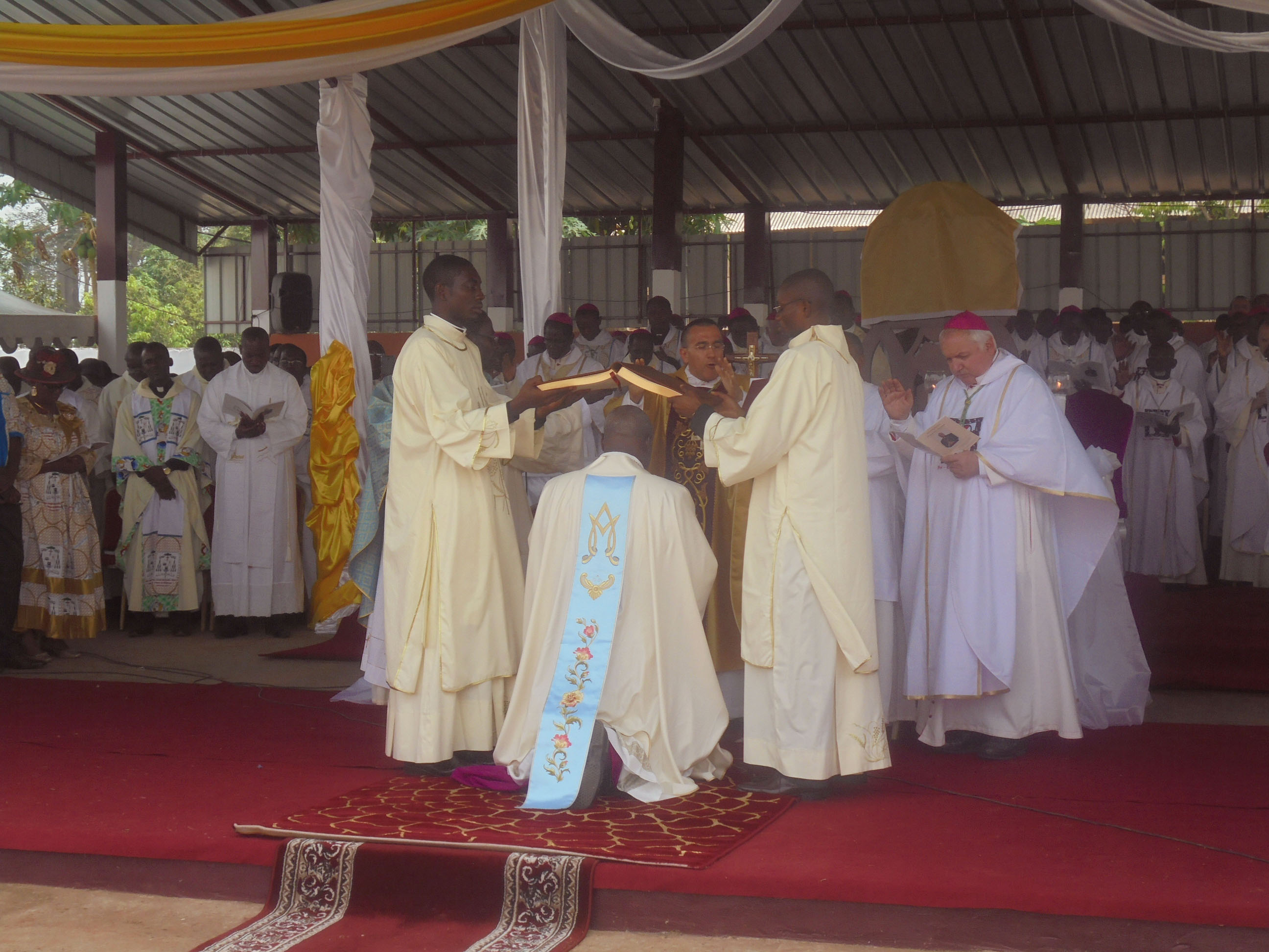 On a estimé à dix mille les fidèles qui entouraient l’estrade de la célébration, ou qui suivaient le sacre de loin sur les grands écrans. Une méga-chorale de trois cents membres a fait prier l’Assemblée et a marqué les moments de joie intense au rythme des instruments locaux et dans une fête de couleurs des pagnes, des tissus imprimés et cousus pour la circonstance.